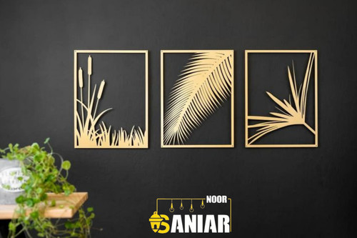 تابلو دکوراتیو طلایی، ست ۳ تکه مدرن، طرح برگ نخل، دیوارکوب نیزار، اکسسوری لوکس دیواری، خرید تابلو پذیرایی.