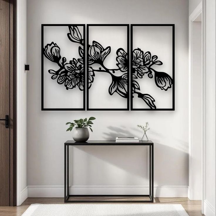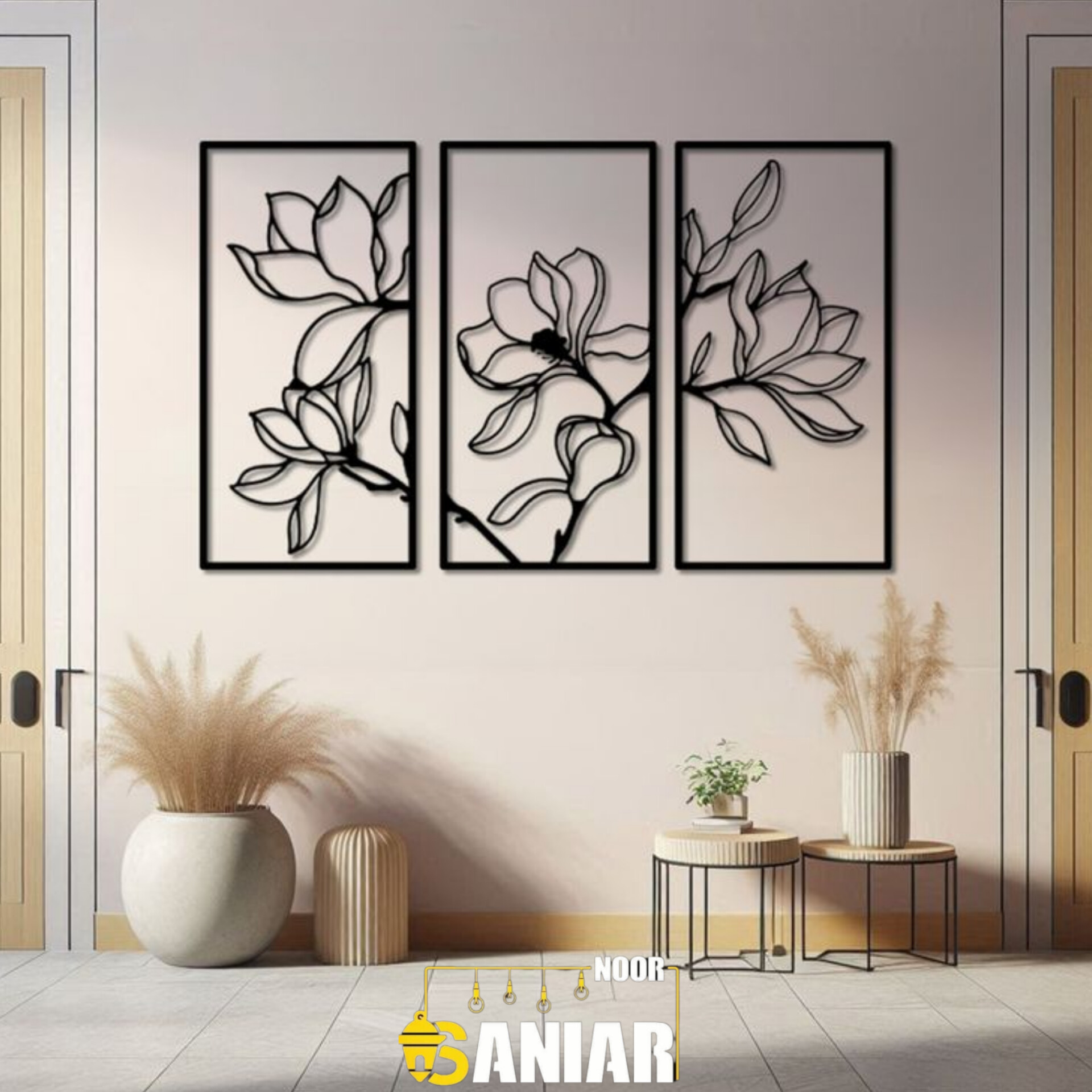 ست ۳ تکه تابلو دکوراتیو طرح "باغ زمستانی" (دیوارکوب فلزی لاینآرت مدل گل ماگنولیا)