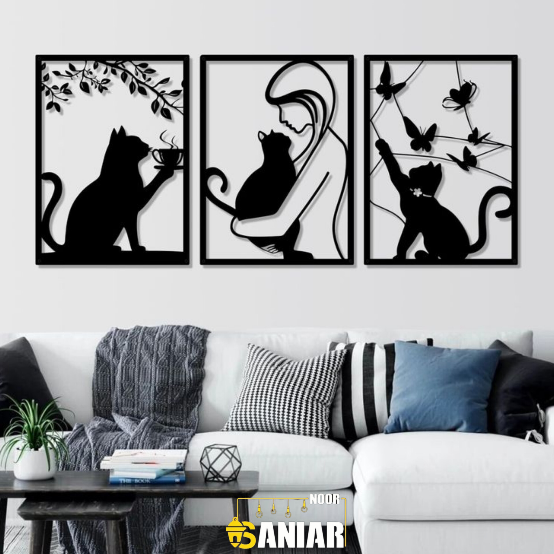 ست ۳ تکه تابلو دکوراتیو طرح "همنشینی با گربه" (دیوارکوب فلزی لاینآرت مدرن)