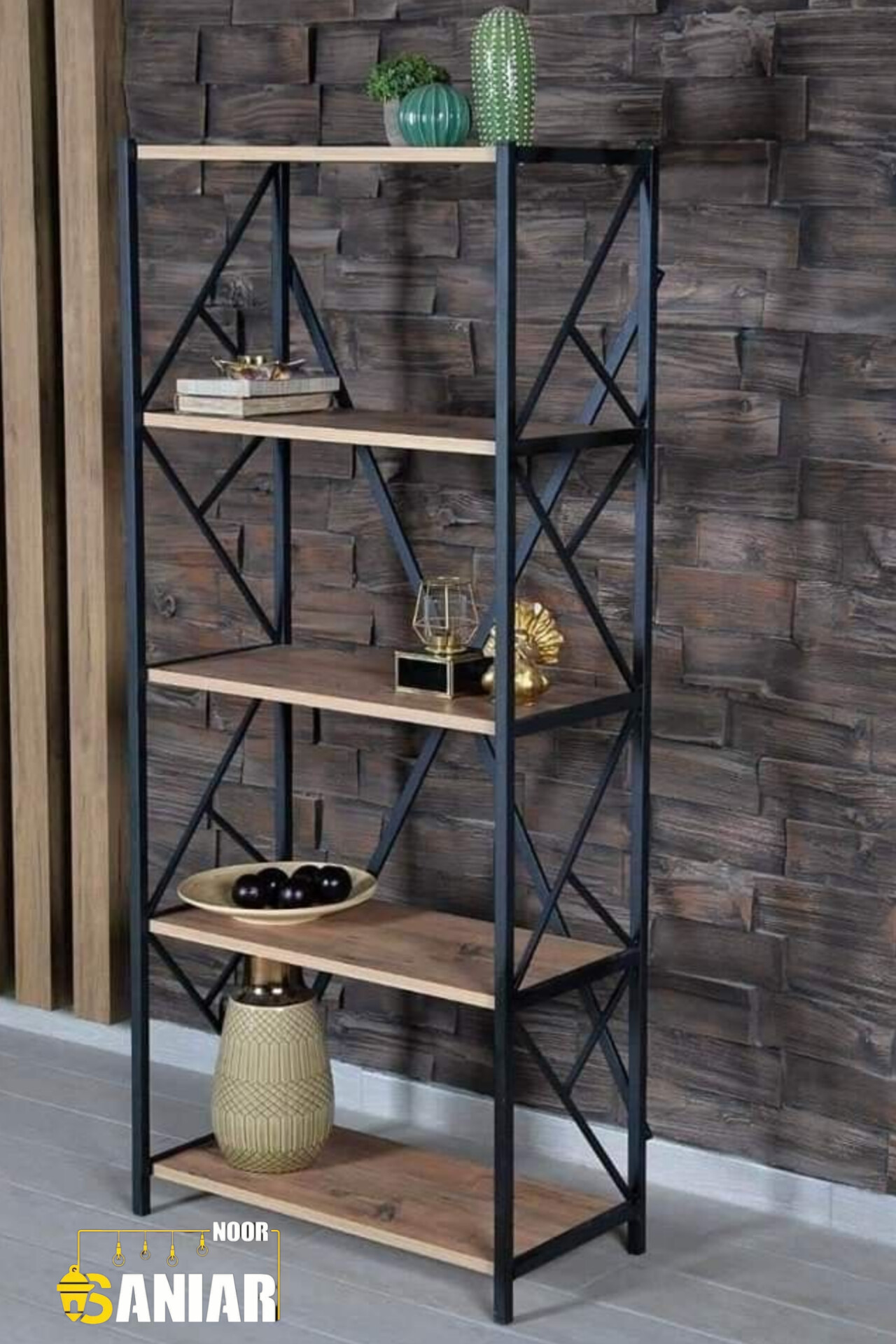 کتابخانه فلزی مدرن طرح زیگزاگی | قفسه دکوراتیو ترکیب فلز و چوب