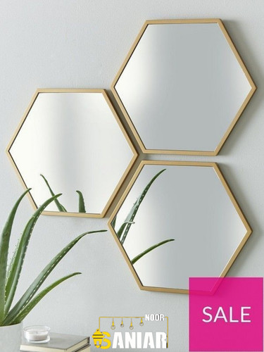 آینه دیواری مدرن شش‌ضلعی | فریم فلزی طلایی مینیمال