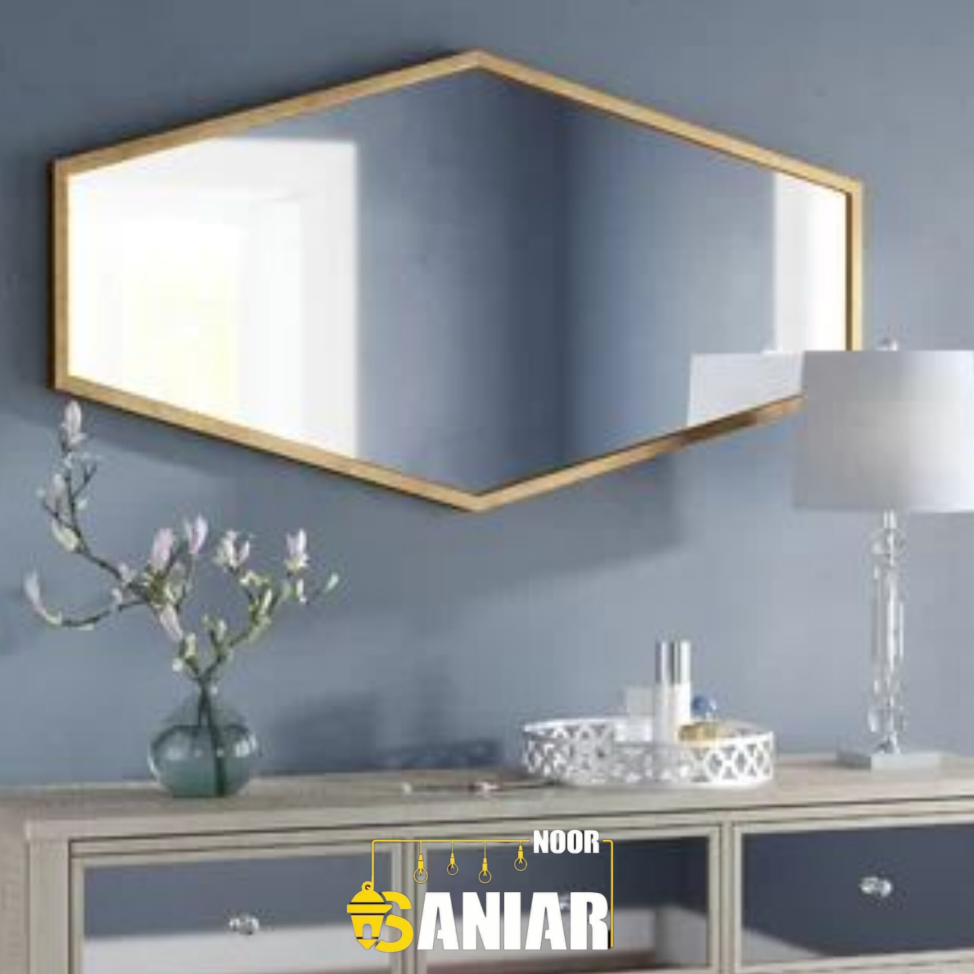 آینه دیواری مدرن شش‌ضلعی | فریم فلزی طلایی مینیمال