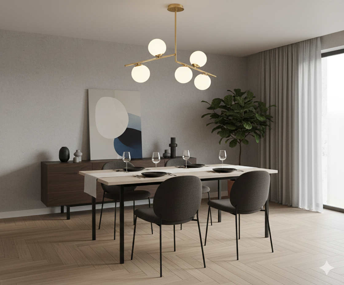 این لوستر مولکولی فلزی با الهام از ساختارهای علمی و طراحی معاصر، جلوهای خاص و متفاوت به فضای داخلی میبخشد. بازوهای فلزی که بهصورت متعادل در اطراف بدنه مرکزی قرار گرفتهاند، نهتنها زیبایی بصری ایجاد میکنند بلکه باعث پخش یکنواخت نور در محیط میشوند.