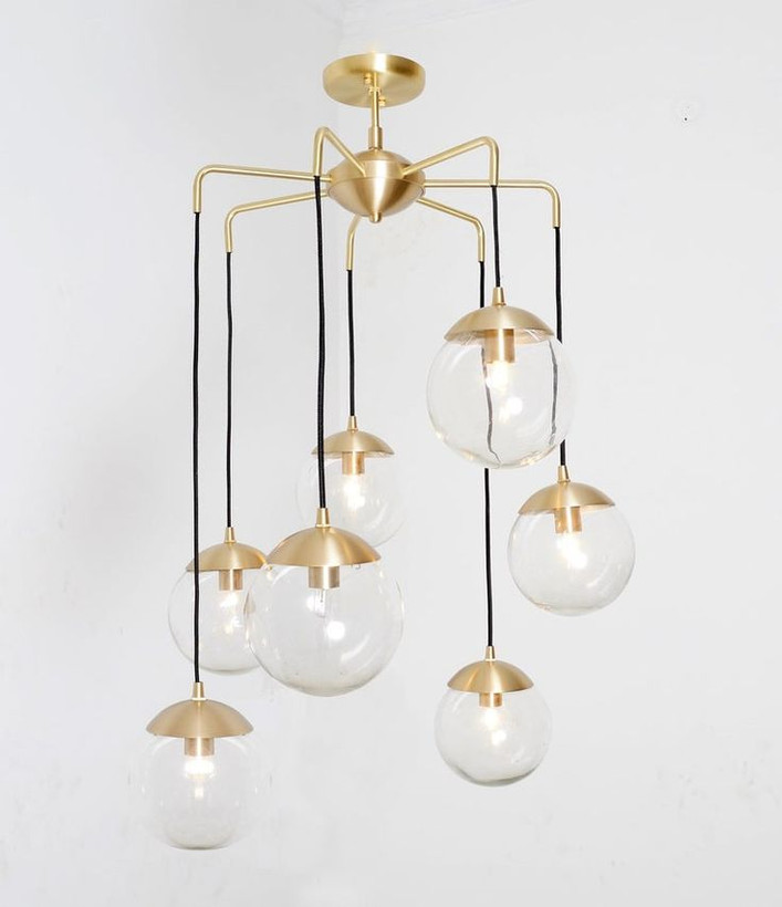 این لوستر با بهرهگیری از بازوهای مهندسیشده و گویهای شیشهای بزرگ، توازنی بینظیر میان متریال فلز و شیشه ایجاد کرده است. چیدمان طبقهای و نامتقارن شعلهها باعث میشود نور در ارتفاعهای مختلف پخش شده و به فضای شما عمق و شکوه بیشتری ببخشد.