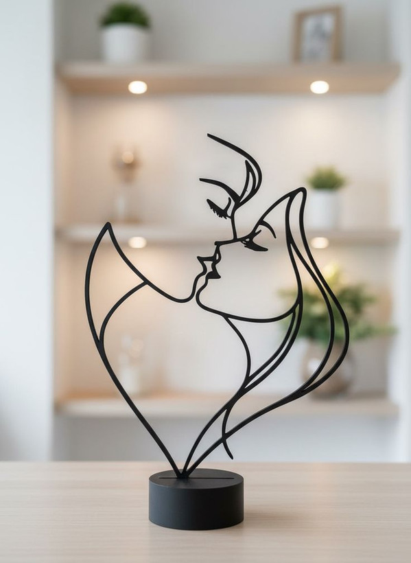 تندیس فلزی رومیزی طرح بوسه، محصولی ظریف از سانیار نور. ساخته شده با تکنولوژی لیزر CNC و رنگ مشکی مات. بهترین اکسسوری مینیمال برای میز کار و شلف دکوری.»تندیس رومیزی طرح "بوسه" یکی از نمادینترین محصولات در مجموعه سانیار نور است که هنر لاینآرت را از روی دیوار به روی میزهای شما آورده است. این استند در تولیدی سانیار نور از ورق فولادی مستحکم ساخته شده و بر روی یک پایه سنگین و پایدار سوار شده است تا تعادل کامل داشته باشد. استفاده از رنگ کورهای الکترواستاتیک توسط برند سانیار نور باعث شده تا این محصول در برابر رطوبت و اثر انگشت کاملاً مقاوم باشد. ظرافت خطوط در این کار به قدری است که در پسزمینههای روشن، جلوهای سهبعدی و سایهوار به محیط میبخشد.