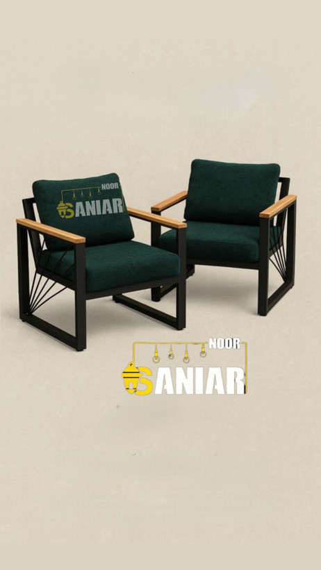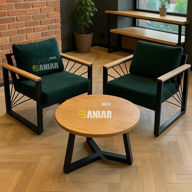 این ست دو نفره با طراحی هنری در بخش کناری (پروفیلهای مورب خورشیدی) و استفاده از چوب طبیعی در قسمت دستهها، تعادلی میان سبک صنعتی و گرمای دکوراسیون مدرن ایجاد کرده است. رنگ سبز تیره پارچه در کنار بدنه مشکی مات، ظاهری بسیار شیک و متمایز به این محصول بخشیده که آن را برای فضاهای دنج، دفاتر کار خصوصی و کافهها ایدهآل میکند.